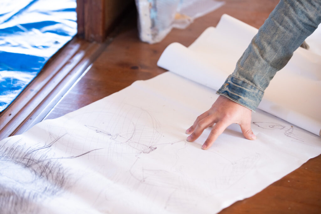「フジサワから突然『遊ぼう』って連絡がきて」。水元さんは当時を思い出しながら語ります。そのとき、水元さんは、フジサワさんとの共通の知人である画家の友人と西都原で絵を描いていました。そのことをそのままフジサワさんに伝えたところ「行くわ!」と返信が。「絵を描いてるって伝えたら普通『終わったら連絡して』みたいになるかと思ってたんですけど。正直、『来て何するんやろ…?』って思ってました(笑)」。「『キャッチボールしようぜ』くらいの感じで遊ぼうって誘った」と軽い気持ちだったというフジサワさんですが、これがひとつ、フジサワさんの美術家人生の大きな転機になります。